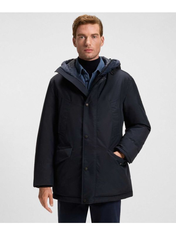 Step into all-weather confidence with the BOSS Osiass1 jacket, engineered to keep you dry and stylish. Its water-repellent finish, high neck, and drawstring hood provide ultimate protection from the elements, while the press-stud and concealed zip closure locks in warmth. Handwarmer pockets, lower flap pockets, and an internal drawstring waist deliver functional style with a tailored touch. Filled with recycled polyester for eco-conscious comfort, this relaxed-fit Hugo Boss jacket is a must-have for everyday adventures. Join thousands of satisfied customers—secure yours today and elevate your outerwear game.