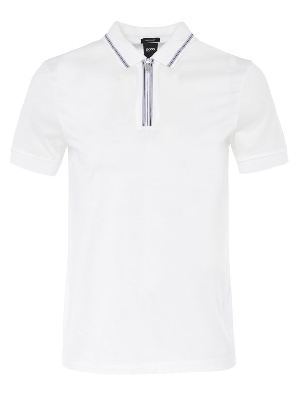The BOSS Paras 04 polo shirt takes inspiration from classic sportswear. Expertly crafted in premium mercerised cotton, the white shirt promises breathability and essential day-long comfort. Featuring a flat knit collar, zip fastening placket and cuffs, whilst the sporty tipped trims make for dynamic detail.