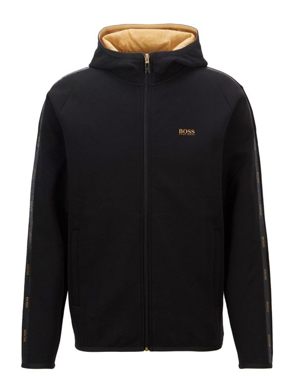 The BOSS Saggy 2 hoodie embraces a stylish sports-luxe aesthetic. Crafted in an interlock cotton blend with stretch, the sweatshirt will ensure day-long comfort. Featuring a fixed hood with zip-through fastening, side pockets and taped trims, whilst the gold-tone hood lining and branded sleeve tape lend sleek contemporary detail.