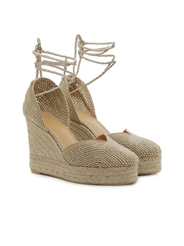 The Castañer Cora espadrille is a summertime staple you can wear for every occasion. These Castañer espadrilles are crafted in shimmering gold jute and rayon. They feature a cushioned insole, closed toe with V-neck and a lace-up closure. Set on an 11cm jute wedge with a double platform, they're the perfect style to add height and a touch of glamour.