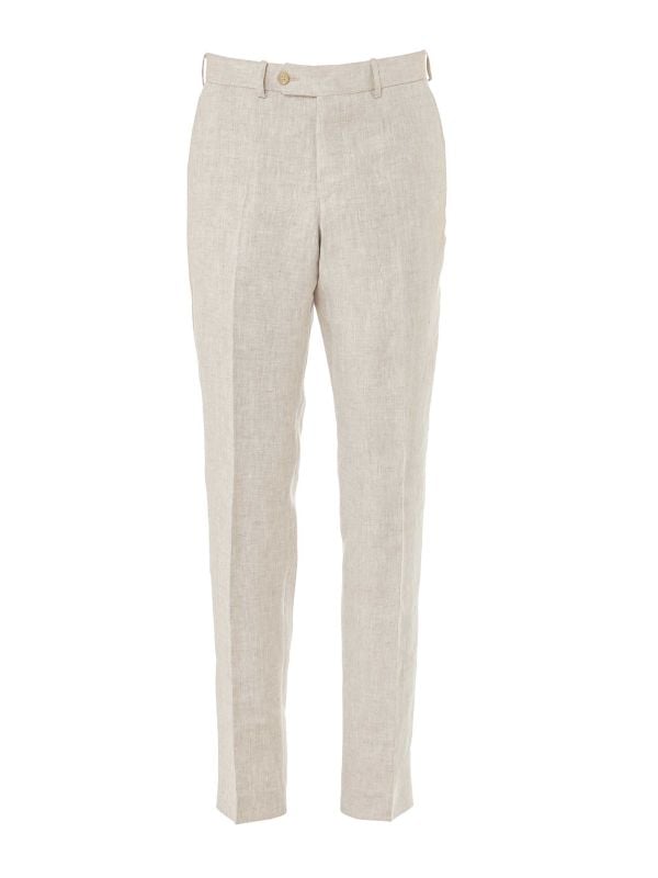 The Cavaliere linen trousers offer a perfect blend of timeless elegance and summertime sophistication. Crafted from high-quality linen, these trousers boast a lightweight and breathable feel, ideal for warmer weather. Featuring a zip fly with a buttoned waist, slash pockets, buttoned seat pockets, and belt loops, they ensure both style and functionality.