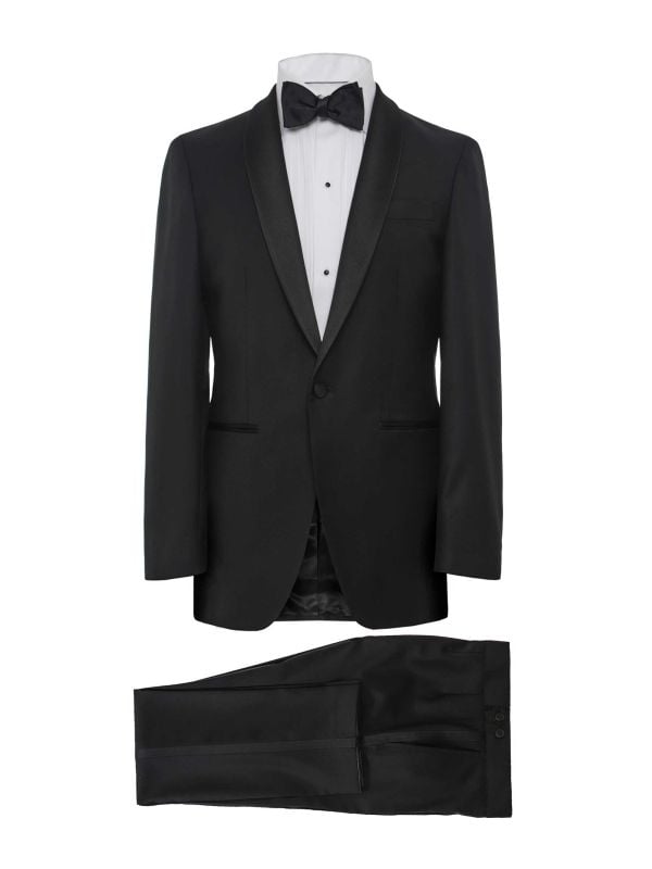 The Cavaliere Royal Shawl tuxedo epitomises timeless elegance and modern sophistication, crafted from luxurious Super 110s wool. This refined two-piece suit features a distinctive shawl lapel and a sleek single button closure, enhancing its classic silhouette.