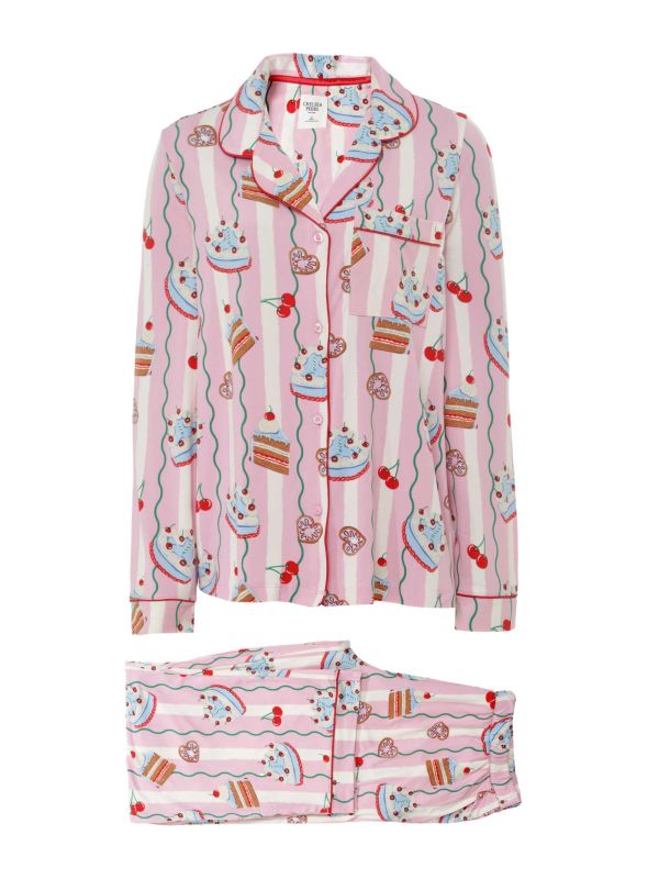 The Cake Print Long Pyjama Set by Chelsea Peers is a sweet style inspired by delicious pastries. Crafted from the label's sumptuously soft recycled jersey, these Chelsea Peers pyjamas are a delightful addition to any collection. The set features a long-sleeved button-up shirt and matching long bottoms, finished with wavy stripes and a hand-drawn print of cakes and biscuits.