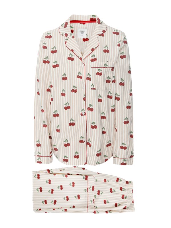 The Cherry Stripe Print Long Pajamas by Chelsea Peers are a two-piece nightwear set featuring a button-up shirt and matching Pants. The shirt has a revere collar, full-length sleeves and a chest patch pocket, finished with contrast piped trim along the placket and cuffs. The wide-leg Pants sit on an elasticated waistband for ease and relaxed wear. A playful cherry and stripe print runs across both pieces, creating a coordinated look that’s comfortable for lounging or sleep. Designed for relaxed evenings at home.