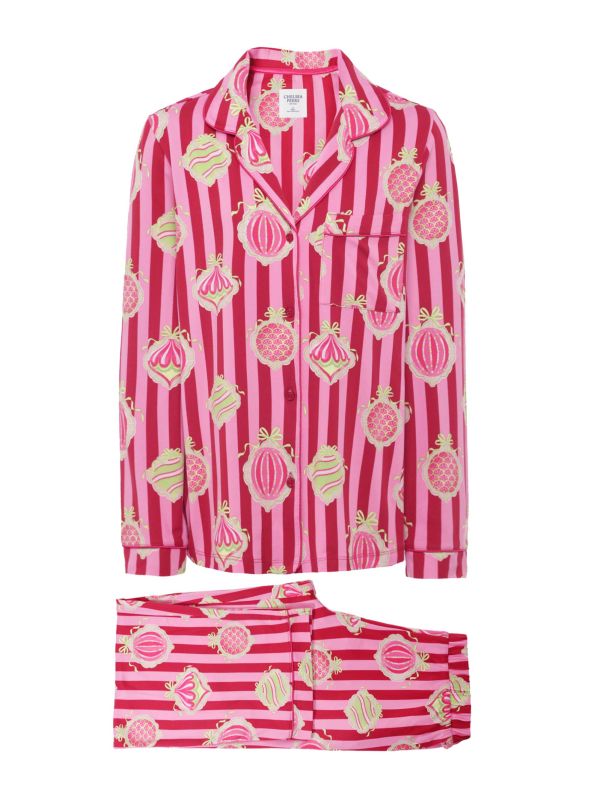 The Christmas Baubles Stripe Long Pyjamas is a two-piece nightwear set by Chelsea Peers. The button-up shirt has a revere collar, piped trim and a single chest pocket. Cut for a relaxed fit, the matching trousers fall full length and feature an elasticated waistband and side pockets for easy wear. Printed stripes and decorative Christmas bauble motifs run across both pieces, offering a playful seasonal look. It’s finished with tonal buttons and neat cuffs for a considered finish.