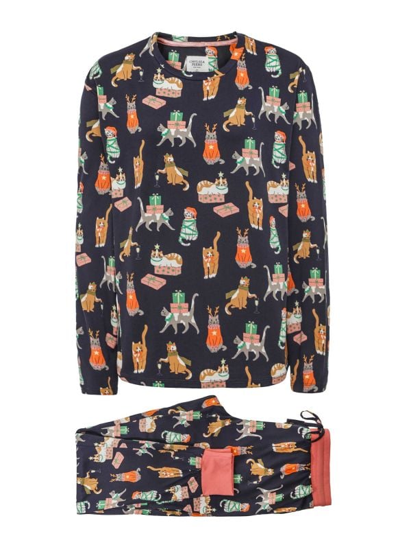 Relax in the Christmas Cats Long Pyjamas by Chelsea Peers. This two-piece set features a crew-neck long-sleeve top and matching drawcord trousers with ribbed ankle cuffs for a neat, comfortable fit. The trousers include side slip pockets and an elasticated waist with a tie for easy adjustment. An all-over festive cat and gift print gives the set a playful seasonal feel, while the soft, fluid construction drapes smoothly for sleep and relaxed days at home.
