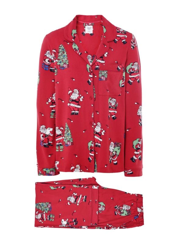 The Christmas Santa Snowball Print Pyjamas from Chelsea Peers are a seasonal two-piece set designed for relaxed nights. A button-through top features a notched collar, piped trim and a chest patch pocket, while the trousers fall to a full length with an elasticated waist and side pockets. Finished with an all-over festive print, this pyjama set offers easy layering and comfortable movement at home. The set fastens with buttons through the front and has neat cuff detailing at the sleeves for a tailored feel.