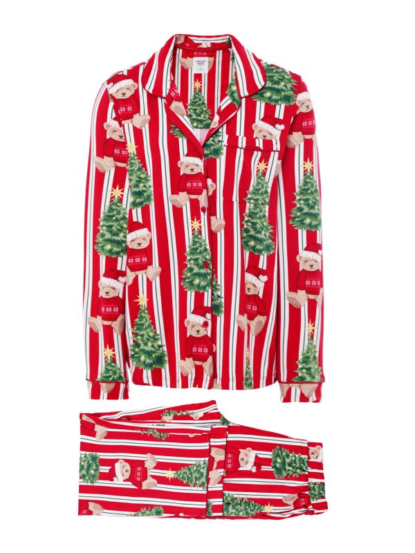 The Christmas Teddy Bear Long Pyjamas by Chelsea Peers are a relaxed two-piece nightwear set finished with a notched collar and button-through front. The shirt includes a single chest pocket and contrast piping; the trousers sit on an elasticated waistband with side pockets for ease. Cut in a full-length straight leg, the set is printed all over with a festive motif of teddy bears and decorated trees, offering playful seasonal styling and comfortable layering for cosy nights in.