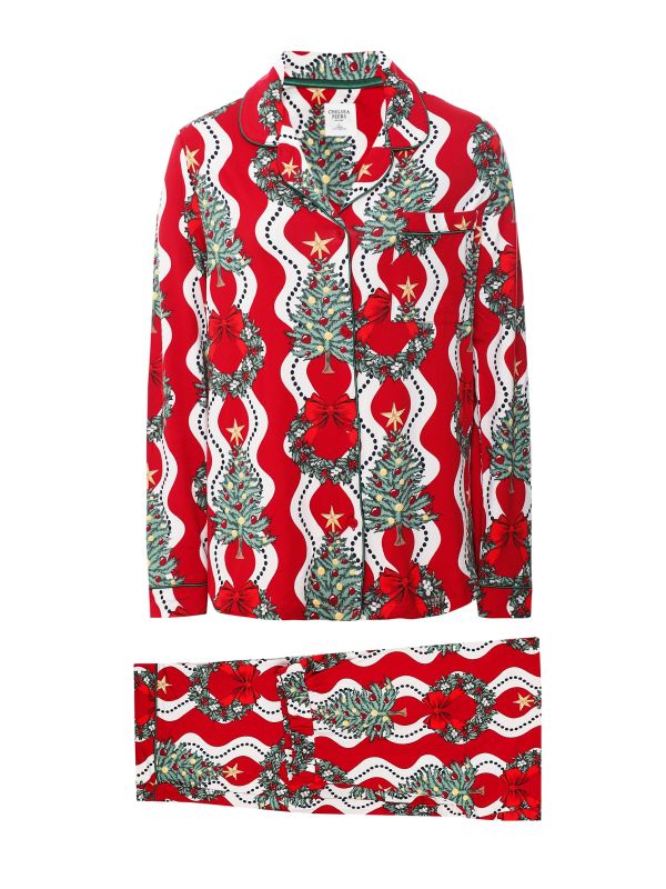 Get in holiday mode and cosy up in the Chelsea Peers Christmas Tree & Wreath pyjama set. These pajamas are made from recycled jersey fabric, making them soft and comfortable for lounging. The shirt is cut with a classic revere collar and button-up front, while the matching trousers have an elasticated waistband for fitting into with ease. The pyjama set features a festive print with Christmas trees, wreaths and contrast waves running throughout.