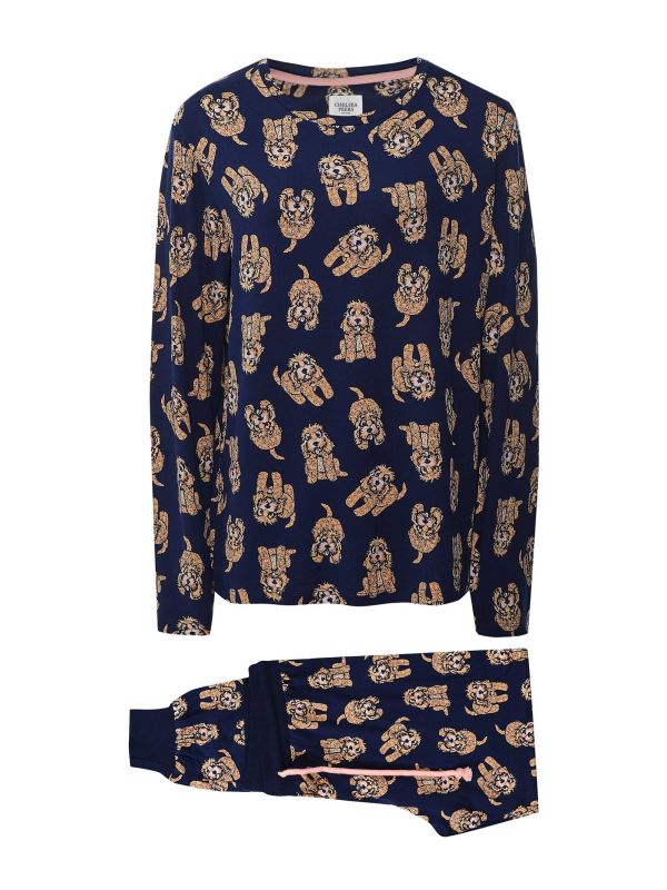 Snuggle up in the extra-soft Cockapoo print pajamas set from Chelsea Peers. This long-sleeve top and jogger bottom combination is made from recycled jersey fabric with cute Cockapoos scattered throughout. They have an elasticated waistband with a drawcord for extra comfort.