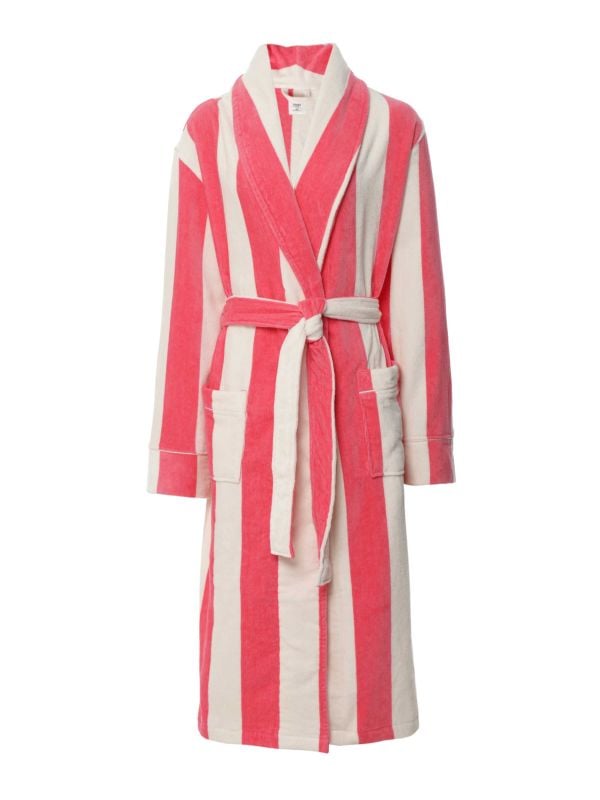 The Cotton Towelling Stripe Robe by Chelsea Peers is cut to a mid-calf length and finished with a generous shawl collar. Long sleeves with subtle cuff detailing and two front patch pockets make it practical for morning routines, while a self-tie belt threaded through loops fastens the robe securely at the waist. The relaxed silhouette allows for comfortable layering and easy movement. A statement striped pattern adds personality to at-home dressing, combining function with a considered, relaxed shape.