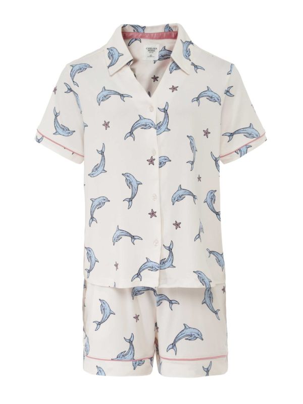 Lovingly cut from the label's extra-soft recycled jersey, the Chelsea Peers Dolphin Print Short Pyjama Set is a sleepwear essential. These Chelsea Peers pyjamas feature a short-sleeve, button-up shirt with a spread collar and shorts with an elasticated waistband. This set is decorated with a hand-drawn print of dolphins and pink starfish, complete with contrast piping and side pockets.