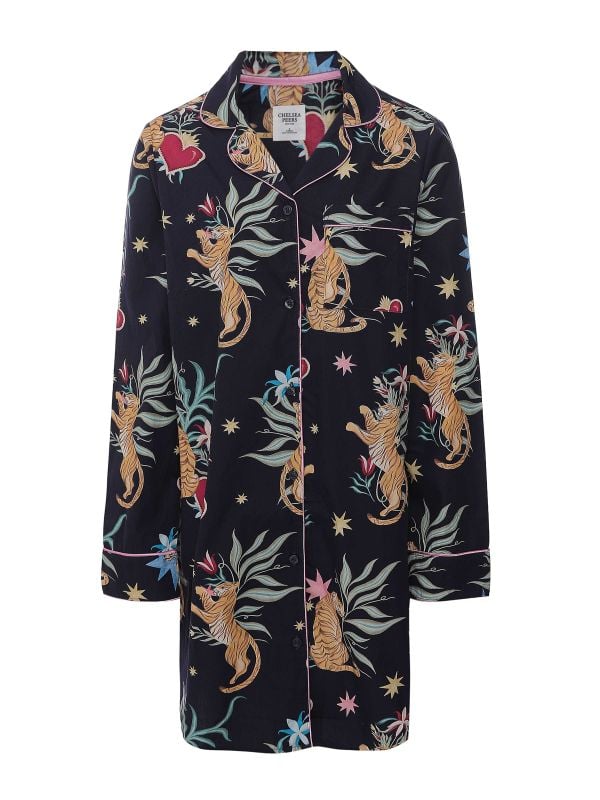 Upgrade your bedtime routine with the Chelsea Peers Enchanted Tiger nightshirt—crafted from certified organic cotton for breathable, luxuriously soft comfort. The revere collar, button closure, and long sleeves offer timeless style, while the chest pocket, contrast piping, and curved hem add modern detailing that customers adore. Finished with the playful Enchanted Tiger print, it’s the perfect piece to feel stylish even at night. If you’re ready to invest in premium sleepwear that combines comfort, personality, and effortless style, grab your Chelsea Peers nightshirt today before it sells out.