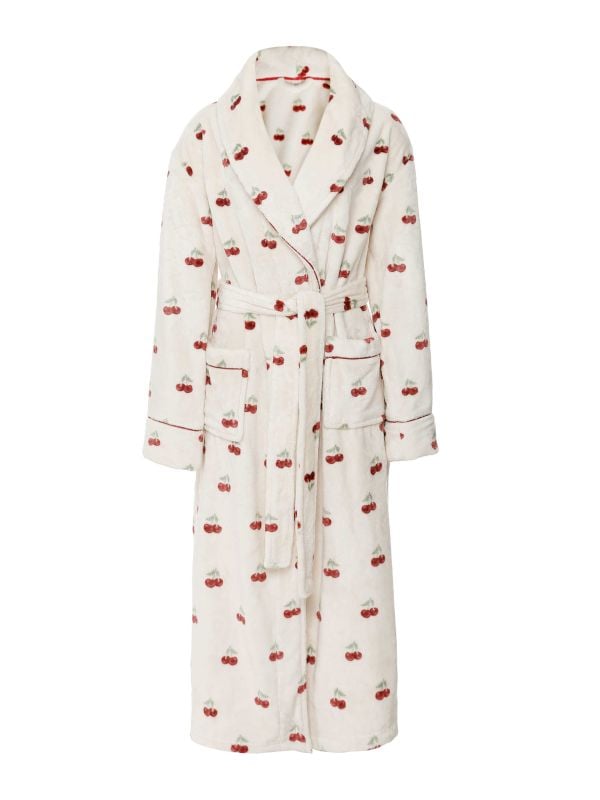 The Fleece Cherry Print Long Robe from Chelsea Peers is a long, Cozy wrap designed for relaxed mornings and winding-down evenings. Cut to a midi length, it features a shawl collar, turned cuffs and piped trim. The robe fastens with a self-tie waist belt and includes two generous patch pockets for essentials. Finished with an all-over cherry print, it works as a practical at-home layer after bathing or for lounging around the house, offering comfort and easy-to-wear functionality.