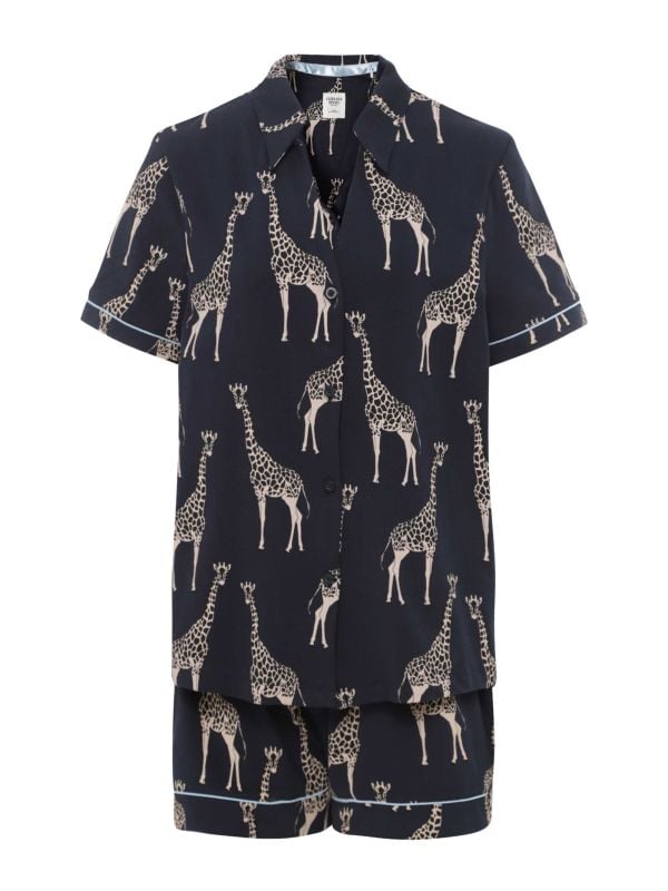 The Giraffe Print Short Pyjama Set by Chelsea Peers is a core style for your sleepwear collection. Crafted from soft organic cotton with stretch for a dreamy fit, these Chelsea Peers pyjamas are sure to deliver a comfortable sleep. The set includes a button-up shirt with a V-neck and short sleeves, and shorts with an elasticated waistband and pockets. It features an all-over, hand-drawn giraffe print, finished with contrast piping.