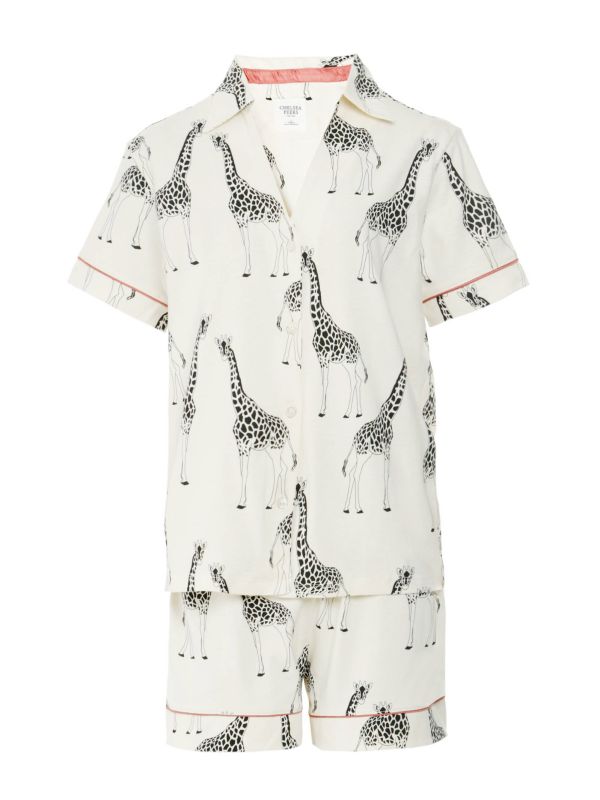 Indulge in the epitome of night-time comfort with the Chelsea Peers giraffe pajamas, a delightful shirt and shorts set meticulously crafted for a luxurious bedtime experience. Made from organic cotton jersey, these Chelsea Peers short pajamas embrace sustainability without compromising style. The shirt boasts a pointed collar with a relaxed V-neckline and a button-up design, exuding charm and sophistication.