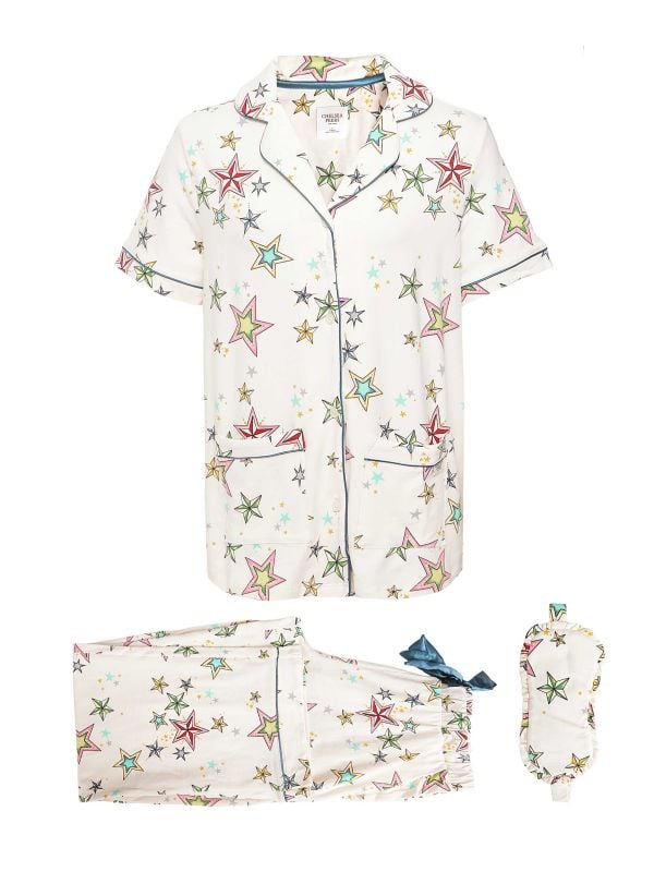 The Organic Cotton Star Print Long Pyjamas by Chelsea Peers are a playful set cut for relaxed at-home dressing. The button-up top has a notched collar, short sleeves, contrast piped trim and twin patch pockets, with a simple button fastening through the front. The matching long trousers have an elasticated waist finished with a ribbon tie for an adjustable fit. The set includes a coordinating sleep mask for a matched look when sleeping or lounging.