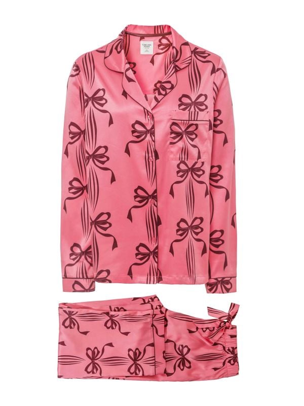 The Satin Bow Print Long Pyjamas by Chelsea Peers update a familiar silhouette with a silky satin finish and bold printed motif. The set comprises a relaxed button-up shirt with a notch collar, piped chest pocket and long sleeves, paired with straight long-leg trousers that feature an elasticated waist and self-tie drawcord. Cut for comfortable, at-home wear, this matching set sits neatly for easy layering and sleeping. Finish details include piped trims at pockets and cuffs for a neat finish.