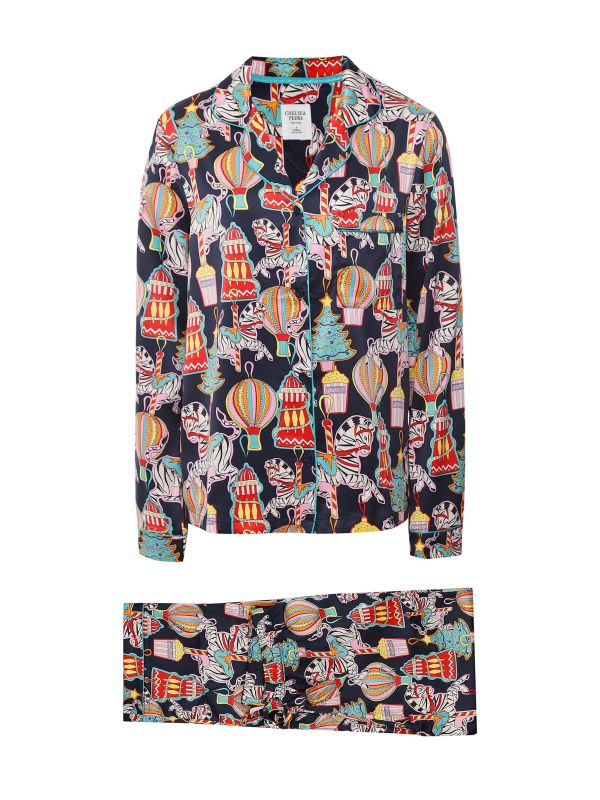 Bring the carnival to your nightwear drawer! The Chelsea Peers Christmas Carnival long pajamas are made from luxurious recycled satin and feature a colourful range of fairground prints, from rides to treats. They are a classic PJ style, with a button-up shirt with a revere collar and matching straight-leg trousers.