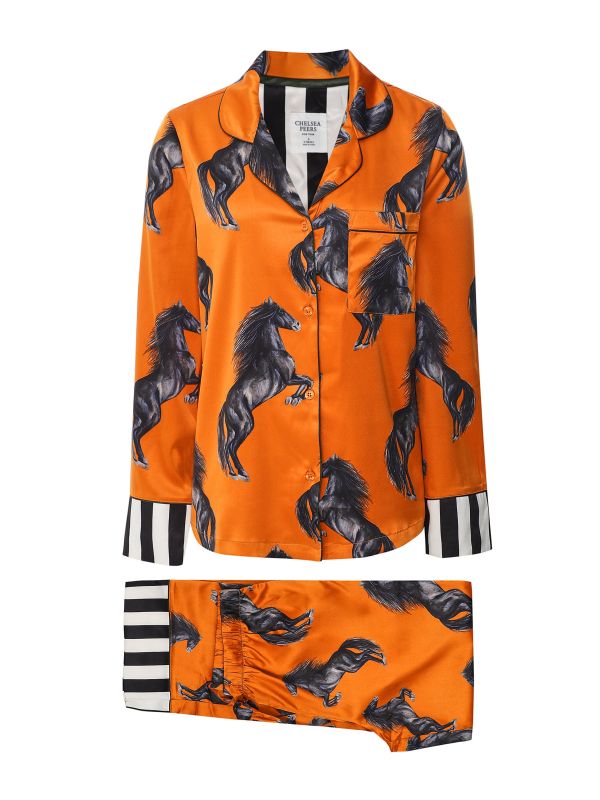 The Chelsea Peers horses print long pyjamas bring the beauty of nature to your sleepwear collection. These luxurious satin pajamas have a classic button-up shirt and straight trousers, scattered with prints of wild horses. The long sleeves and full-length legs are complete with contrast striped trims, creating a stand-out pair.