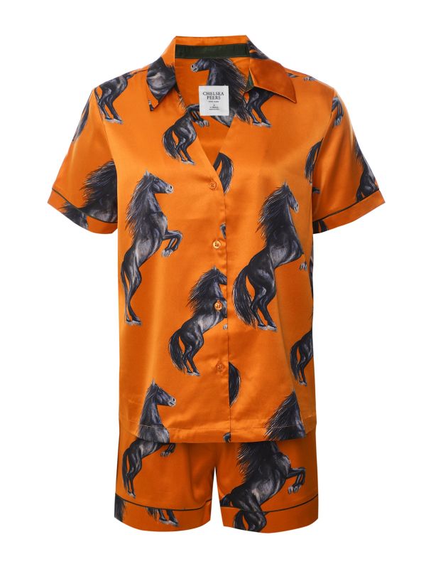 The Chelsea Peers satin horses print short pyjamas are the perfect addition to your sleepwear drawer. This shirt and short set feature galloping horses throughout, bringing a touch of nature to your relaxation time. The shirt is a classic button-up piece with a point collar. The shorts are matching with an elasticated self-tie waist.
