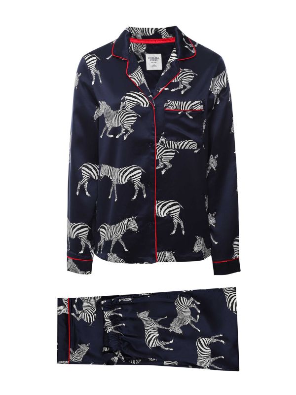 The button-up shirt, featuring a revere collar and a chest pocket, exudes sophistication, while the regular pants boast an elasticated waist for supreme comfort. The vibrant red piping adds a striking contrast to the repeat zebra print, creating a visually captivating ensemble. The slouchy-fit silhouette enhances the overall comfort, making these Chelsea Peers satin PJs not only a fashion-forward choice but also an indulgent treat for those seeking luxurious loungewear.