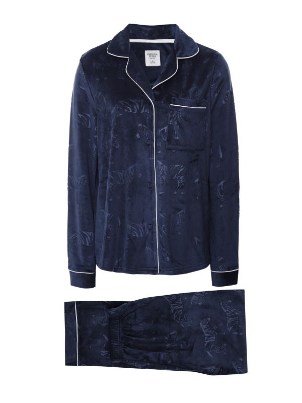 The distinctive embossed zebras pattern, highlighted by white piping, adds a playful touch to the ensemble. The slouchy-fit design of these Chelsea Peers velour pajamas ensures a relaxed and cosy feel, making them ideal for a restful night's sleep. Perfectly combining style and comfort, these Chelsea Peers long pajamas are a testament to the brand's commitment to creating premium sleepwear for a truly indulgent experience.