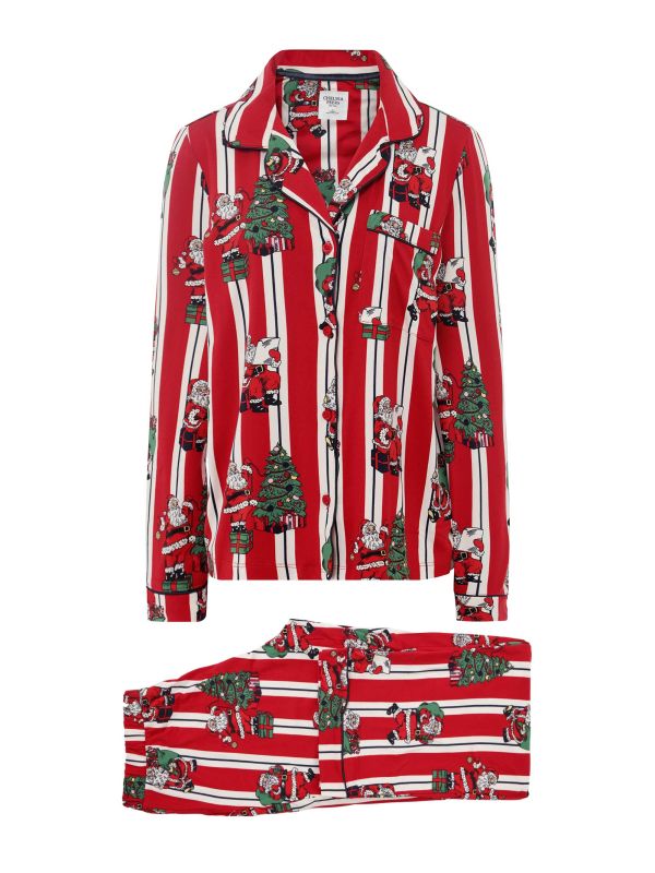 Get into the festive mood with the Chelsea Peers Vintage Santa Print pyjamas. These Chelsea Peers pyjamas are made from a super soft fabric and feature all-over red and white stripes with a vintage santa print. The set includes a button-up shirt with a revere collar, long sleeves and a single chest pocket to pair with the matching bottoms, complete with an elasticated waistband.