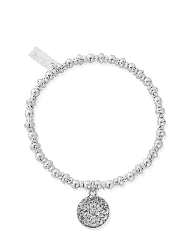 The Didi Sparkle Moonflower Bracelet by ChloBo is a slip-on style crafted from sterling silver. This ChloBo bracelet is a versatile piece perfect for every day or occasions that require a touch of glam. It features a combination of two beads and an eye-catching moonflower charm. It's complete with a branded silver tag.