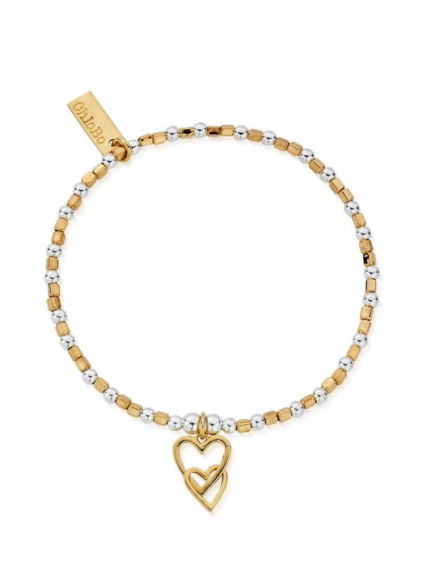 Fall in love with the Interlocking Love Heart Bracelet by ChloBo, a statement piece in a mixed metal design. Crafted from sterling silver and 18ct gold-plated silver, this ChloBo bracelet is made up of beads and cubes. It features two interlocking hearts representing love and compassion, complete with engraved branding.