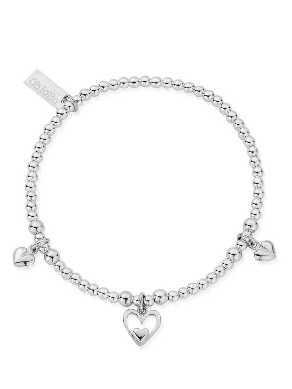 Add texture to your jewellery stacks with the Triple Heart Bracelet from ChloBo. Created using 925 sterling silver, this ChloBo bracelet offers a slightly chunky silhouette with beads, finished with two puffed heart charms and a third heart charm with a smaller heart within. It's the perfect piece to spread the love, whether as a gift to yourself or a loved one.