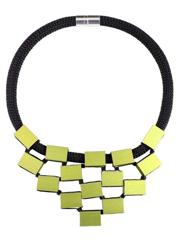 Make a statement in the Aluminium Cube necklace from Greek designer Christina Brampti. This necklace features interlinked geometric cubes that form a flattering pattern and a chunky rope with a magnetic clasp closure. Style it with a deep V neck top or over a high-neck for a layer of texture.