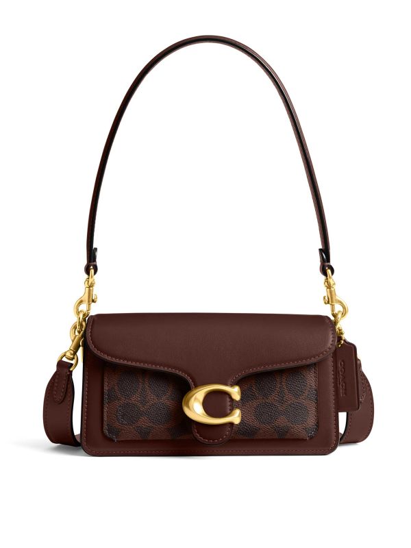 The Tabby Signature Canvas Shoulder Bag 20 is a compact, refined design from Coach. A structured flap silhouette features signature C hardware on the front and a curved exterior slip pocket at the back. Constructed with a mix of coated canvas panel and smooth leather trim, it comes with both a short top handle and an adjustable, detachable long strap for shoulder or crossbody wear. Practical yet refined, the bag secures with the flap and hardware fastening and shows branded metalwork on the clasps and fittings.