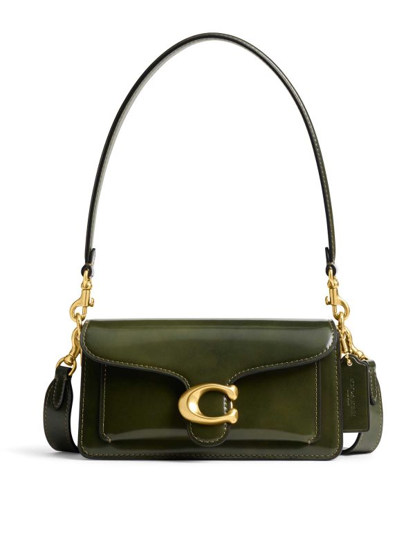 The Tabby Spazzolato Shoulder Bag 20 is a compact, sculpted design from Coach. Polished panels define its structured silhouette and a prominent C clasp secures the front flap. Both a short top handle and an adjustable, detachable long strap are included so it can be carried by hand or worn crossbody. The bag has an external back slip pocket for quick access and presents neat capacity for daily essentials. Statement hardware and considered detailing give this design clear character without compromising practicality.