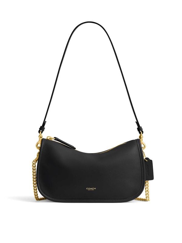 The Waverly Crescent Shoulder Bag is a compact, curved silhouette from Coach. It is crafted from smooth leather and finished with gold-tone hardware, featuring a detachable chain strap and an adjustable leather shoulder strap for versatile wear. A top zip secures the main compartment while a small embossed Coach logo marks the front. Compact proportions make it easy to carry from day to night, converting between shoulder and crossbody styles to suit different looks and needs.