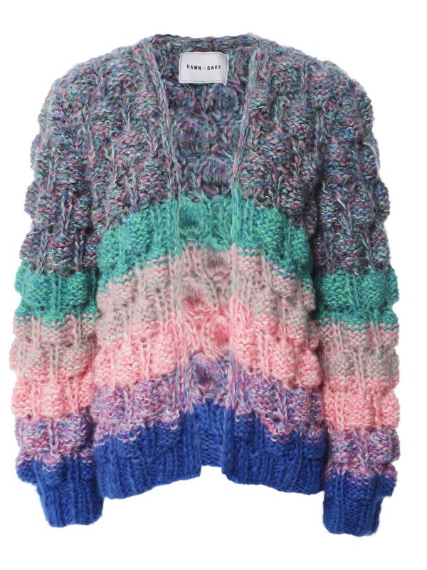 The ribbed trims add a touch of structure to the cardigan's relaxed silhouette, giving it that easy, loose fit that feels just right. Hand-knitted in Italy with meticulous attention to detail, this Dawn X Dare cardigan is a dreamy blend of comfort and style—wear it, and you'll feel like a walking rainbow of cosiness and charm!