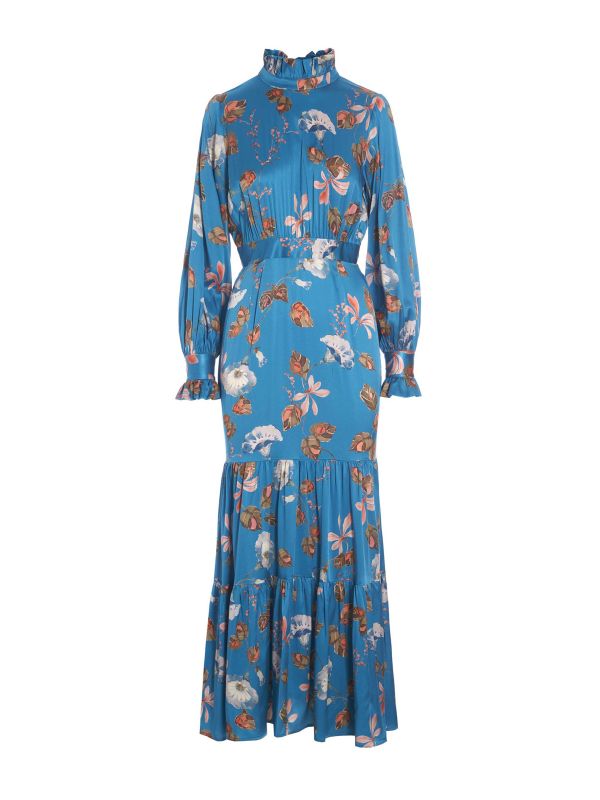 The Dea Kudibal Celestina dress is a chic choice for the new season. Lovingly crafted in premium silk with a slight stretch, the dress promises a smooth and soft handle. Featuring a stylish high ruffle collar with pleated voluminous sleeves, whilst the body skimming shape elegantly sits over the hips before flaring to a beautiful tiered maxi skirt.