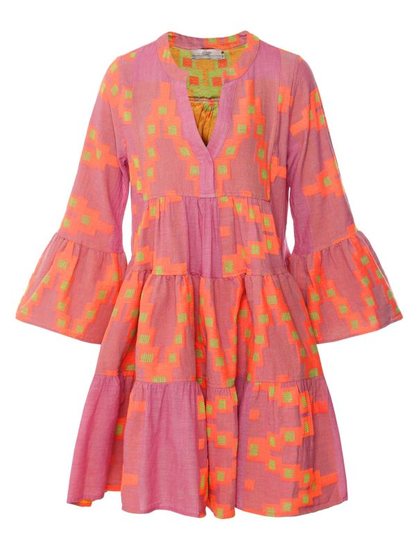 The Devotion Twins Ella mini dress is perfect for a festival outfit. Crafted from an airy cotton blend with a geometric jacquard pattern throughout, this piece will bring a bold and bodacious essence to your summer wardrobe. A tunic-style V-neck and flared long sleeves paired with an A-line tiered skirt complete the look.