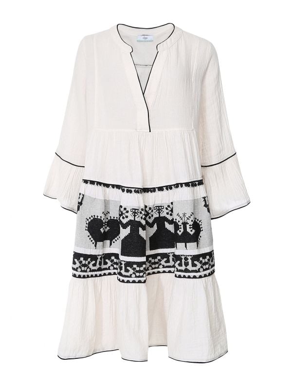 This beautiful Devotion Twins mini dress is made from pure cotton for a lightweight yet luxurious feel, ensuring elevated comfort and style on summer days. The dress features a stand collar, V-neck and statement 3/4 bell sleeves, whilst contrast piping and embroidered detailing provide a unique finish. Wear with sandals and sunnies this season.