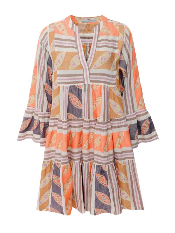 Introducing the Hermosa Dress from Devotion Twins. This mini dress is cut for a pretty A-line silhouette with a playful multicoloured print featuring stripes and leaf shapes. It showcases a V neckline with concealed snap button, long sleeves with flared ends and a tiered skirt. Style with your favourite summer sandals for an iconic look this season.