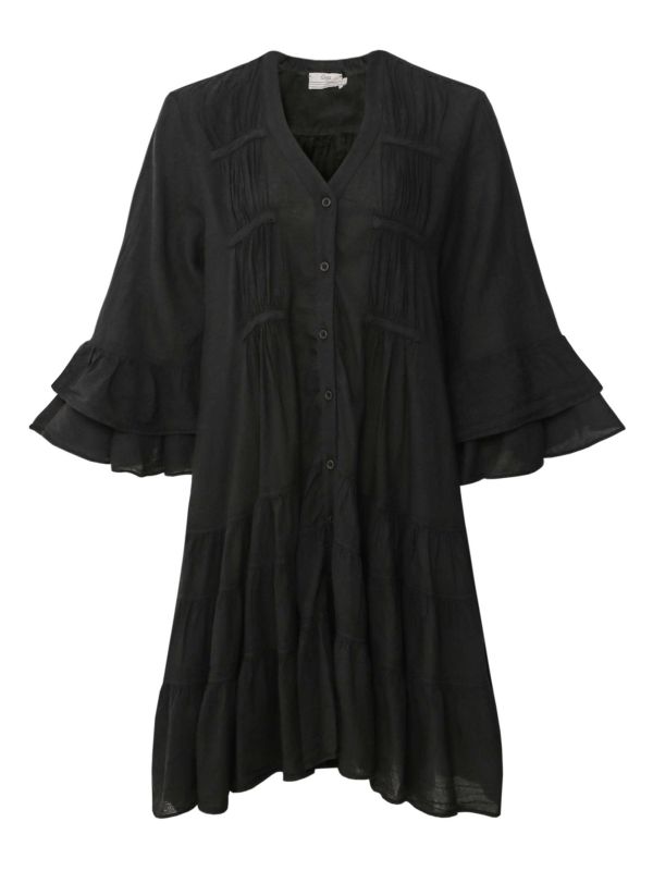 Get an elegant everyday look with the Devotion Twins Tourmalini dress. Cut from pure cotton, this breathable summer dress features a V-neckline, button-down fastening and 3/4 flared sleeves with a feminine flounce trim. This Devotion Twins dress is complete with unique gathered details, pleating and a tiered skirt.