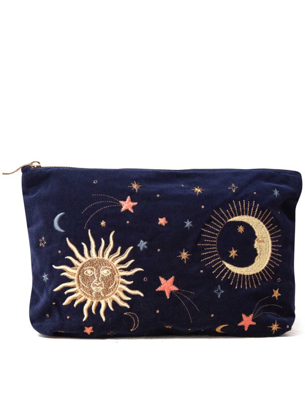 The Elizabeth Scarlett Celestial Everyday Pouch features detailed embroidery of suns, moons and stars across the plush velvet exterior. Sized for everyday essentials, it has a top Zipper closure and a branded metal Zipper pull to keep contents secure. The pouch has a rectangular shape and a lined interior for organisation, making it suited to cosmetics, small accessories or travel. Its roomy interior and thoughtful proportions make it ideal for both daily use and short trips.