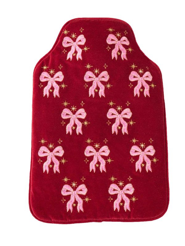 The Elizabeth Scarlett Dazzling Bows Hot Water Bottle is a plush, decorative cover that comes with a 2L hot water bottle. It features repeat embroidered bow motifs with metallic star accents across a velvety outer, piped edges and an envelope back opening to slot the bottle in securely. Generously padded for lasting warmth and tactile comfort, the cover brings a playful, decorative accent to bedside, sofa or armchair.
