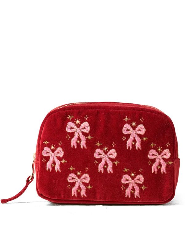 Elizabeth Scarlett presents the Dazzling Bows Makeup Bag, embroidered with repeating bow motifs and delicate star accents. The compact, structured shape offers protective storage for daily cosmetics, while the gold-tone Zipper with a branded pull ensures secure closure and easy access. A fabric tab on the Zipper gives extra grip and decorative detail. Ideal for everyday use or special occasions, it stores essentials neatly. Practical for travel or to keep in a larger bag, this makeup bag is a pretty, purposeful accessory.