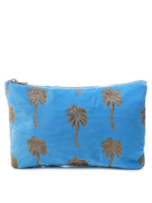 The Gold Palm Everyday Pouch in blue by Elizabeth Scarlett is inspired by tropical destinations, featuring golden palm trees scattered across vivid blue velvet. Made to accompany your summer plans, this Elizabeth Scarlett bag works as a statement clutch bag or simply carry it in your handbag to store your daily essentials. It has a cotton lining and closes with an engraved gold zip.