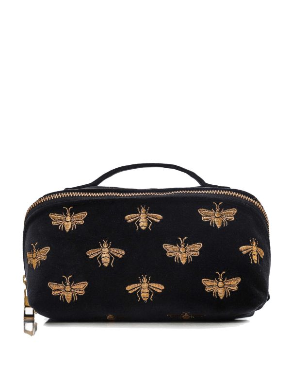 Purposefully designed to lie flat on a surface, Elizabeth Scarlett's Honey Bee Open Flat Makeup Bag is a must-have for those passionate for organisation. Fashioned from plush velvet embroidered with playful honey bees, this Elizabeth Scarlett makeup bag is as pretty as it is practical. It's complete with a gold zip-around closure, a top handle, interior pockets and a wipeable lining.