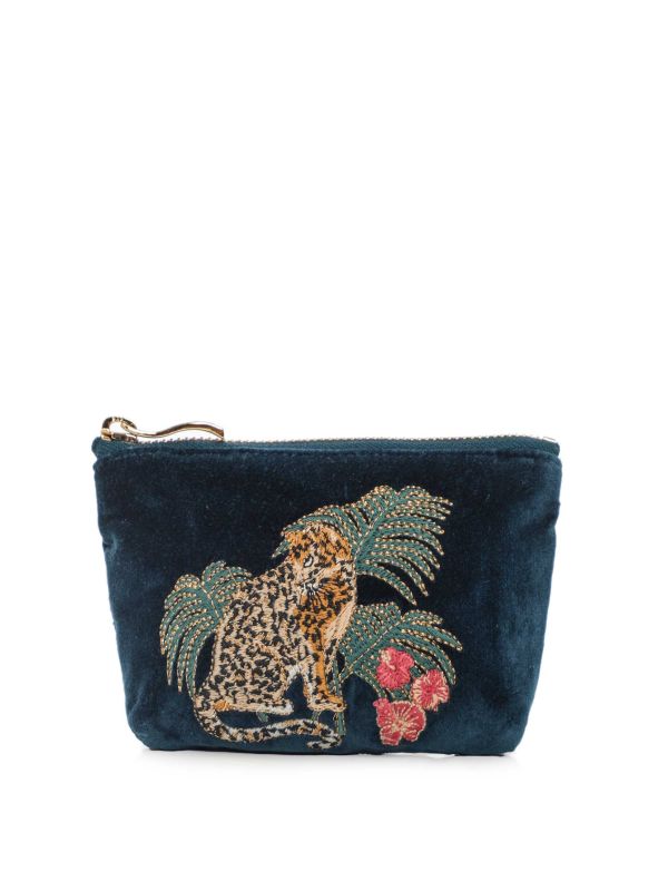 The Jungle Jaguar Coin Purse by Elizabeth Scarlett is a compact zipped accessory ideal for organising coins and small essentials. The pouch features a detailed embroidered jaguar and foliage motif and a structured shape to protect contents. A sturdy metal zip with pronounced teeth ensures secure closure, while the boxy silhouette allows easy storage in larger bags. Finely stitched seams and a soft pile exterior enhance texture. Practical for daily use or as a gift, this purse brings distinctive designer detailing to everyday organising.