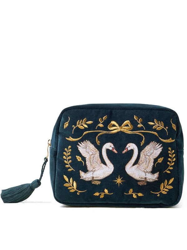 The Majestic Swans Wash Bag is a decorative toiletry pouch by Elizabeth Scarlett. Finished with embroidered twin swans and foliage motifs, it features a gold-tone metal Zipper with a braided tassel pull. The compact, structured silhouette is ideal for organising cosmetics and travel essentials, while the secure Zipper closure helps keep items protected on the move. Practical for use at the dressing table or in luggage, this wash bag combines embroidered detail with everyday functionality.