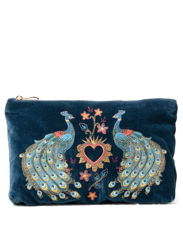 The Peacock Floral Everyday Pouch is a decorative bag from Elizabeth Scarlett. Fashioned beautifully with a plush velvet exterior, it displays fine embroidery of a pair of peacocks in a secret botanical garden. A gold zip fastening secures the pouch's contents for day-to-night styling. Perfect for events or travel, the rectangular silhouette is a compact design for storing small essentials.