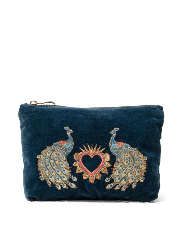 Set on Elizabeth Scarlett's signature plush velvet exterior, the Peacock Floral Mini Pouch is a small luxury accessory that elevates. The double-sided design showcases a pair of exuberant peacocks carefully embroidered and shimmering with golden threads, ensuring this mini bag adds a finishing touch to any look.